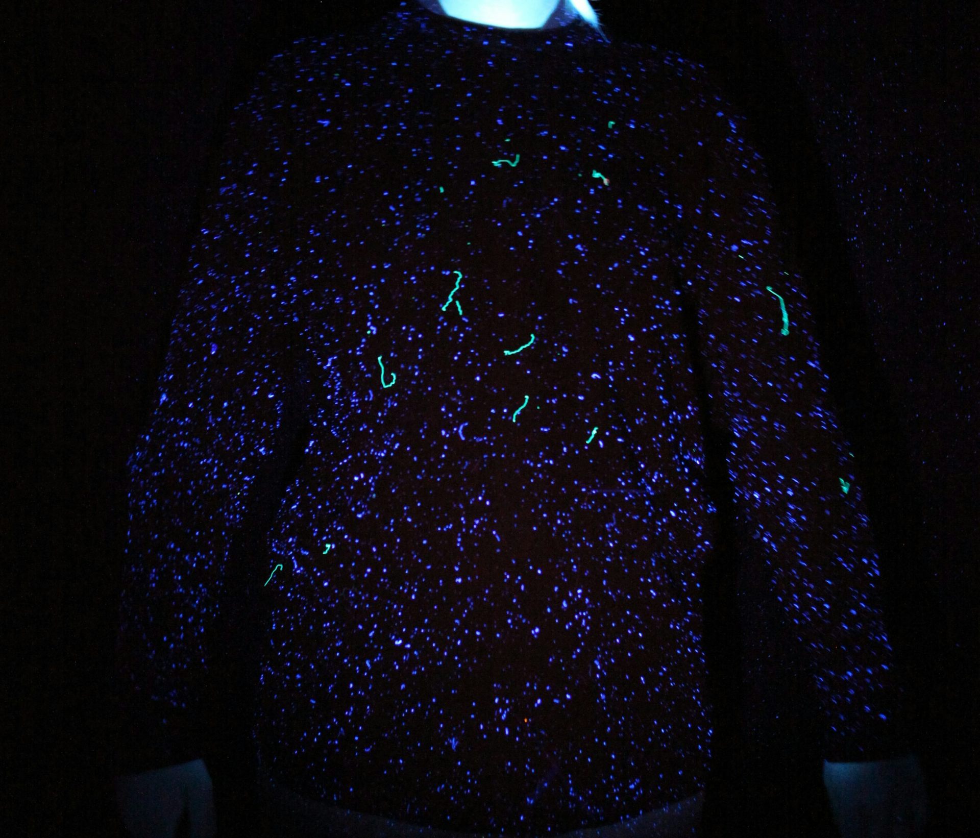 In our experiment we used everyday garments – jumpers, long sleeved tops and fleeces – that were fluorescently dyed. This allowed us to track the airborne transfer of their fibres between garments.