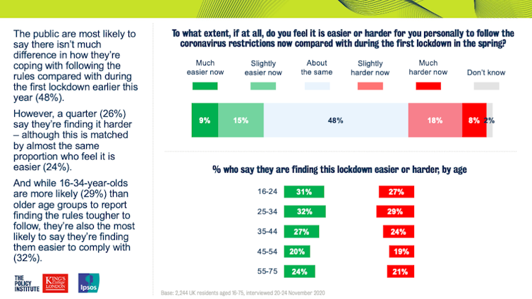 But while most people show little sign of reduced compliance, a notable minority have had a very different experience: one in six admit they’ve not been as careful in obeying the rules, and one in four say they’ve found it tougher to follow them recently.