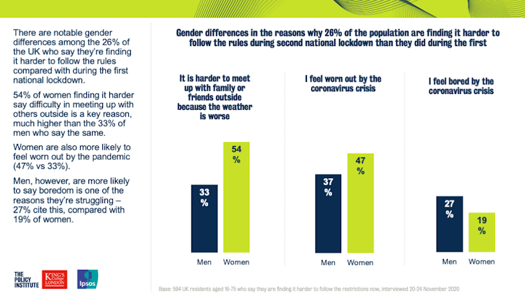 The gender divisions seen in our research point to how different people are facing very different challenges as a result of the COVID-19 crisis. Responding in a way that deals with the pressures everybody is under is a difficult task – but starting from a principle of support is key. Not all of us are managing to obey these severe rules, but if we hope to change that, compassion – rather than condemnation – is likely to be most effective.
