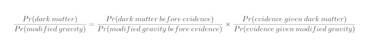 If we accept that the most sophisticated versions of modified gravity and dark matter theory are equally supported by the evidence, then the likelihood ratio is equal to one. That means the final decision depends on the initial probabilities of these two hypotheses.