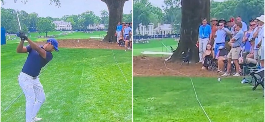 Spectators barely had time to react as the ball narrowly missed them and cannoned back off a tree trunk. Having endured a narrow escape, people then scrambled to see where Rai’s ball had landed, with the tree just yards away from where he’d stood to take his second shot.