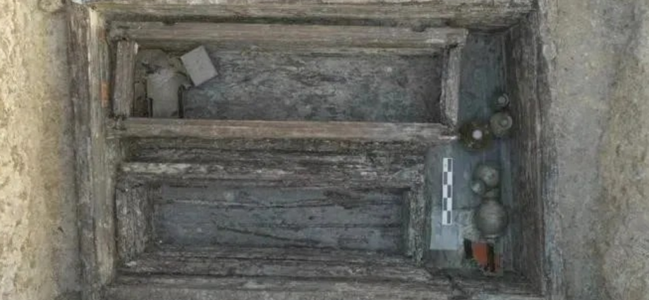 Archaeologists also found the “exquisitely crafted and uncommon” traces of a coffin carriage with “two round wooden wheels” likely used to transport the deceased to the grave site.