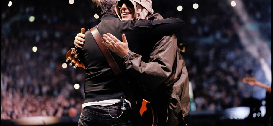 “The great wait is over!” declares one of dozens of newspaper headlines flashing up on the screen at Oasis’s final UK reunion show. Out come the brothers arm-in-arm: Liam and Noel Gallagher in the flesh. Could it be, thinks the 90,000-strong full-house at Wembley Stadium, that they are really embracing together on that stage? That they have held out on feuding for the 39 dates thus far to get here, immediately opening, appropriately, with the chaotic static of “Hello”?