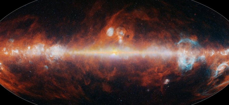 Taken using the agency’s SPHEREx space telescope, the first all-sky map simulates the instrument’s three-dimensional view of the sky, including the burnt red cosmic dust, electric blue hydrogen gas and white, blue and green stars.