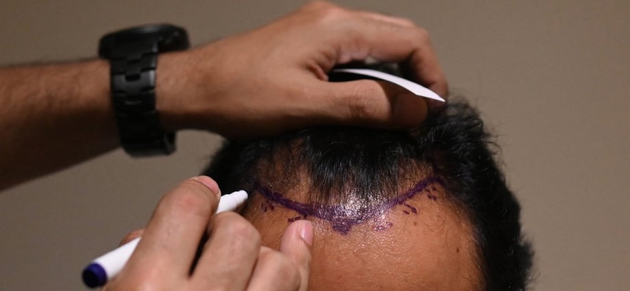 File. Hairline markings are made on a hair transplant patient’s scalp
