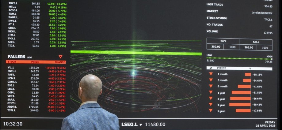 The biggest fallers on the FTSE 100 were Endeavour Mining, down 114.0p at 4,606.0p, St James’s Place, down 25.0p at 1,211.0p, Kingfisher, down 5.8p at 282.9p, Howden Joinery, down 15.0p at 799.0p and Experian, down 47.0p at 2,592.0p.