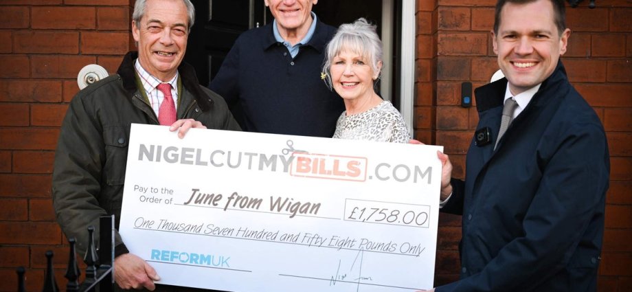 June from Wigan was announced as the winner earlier this month. In a video posted on social media, Mr Farage could be seen handing over flowers to June and her husband in their foyer, as the party’s treasury spokesman Robert Jenrick held a giant cheque.