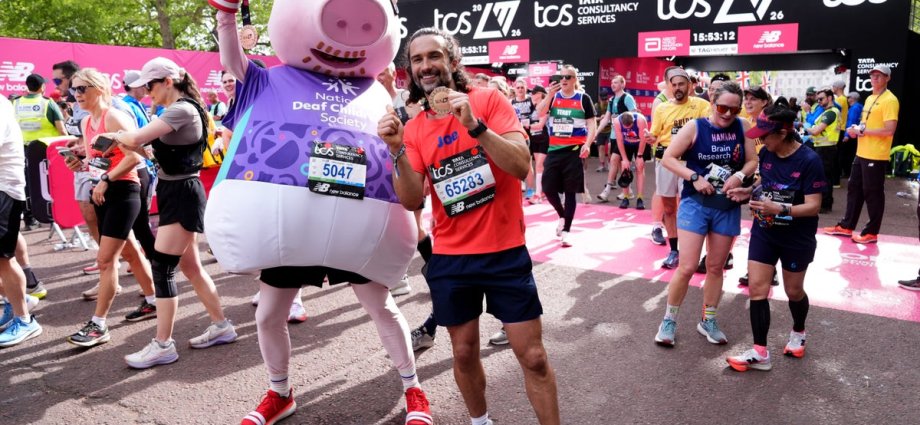 The distinctive Peppa Pig theme tune heralded the arrival of children’s TV character Daddy Pig at the finish line, accompanied by “The Body Coach” Joe Wicks. The pair completed the course in five hours and 51 minutes, running in support of the National Deaf Children’s Society, following a storyline in Peppa Pig that revealed George Pig is moderately deaf.